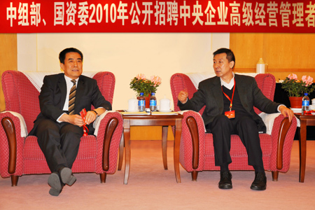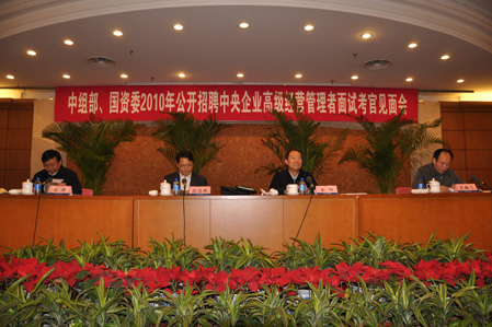 12月4日至5日,中組部、國資委2010年公開招聘中央企業高級經營管理者面試工作在北京舉行,114名考生在1001名報考人員、307名筆試人員中脫穎而出,分別參加了13個職位的面試。面試中,國資委主任、黨委書記王勇,中組部副部長王爾乘,國資委副主任、黨委委員金陽到現場巡視。