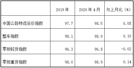 表1 2020年4月中國公路物流運價指數表