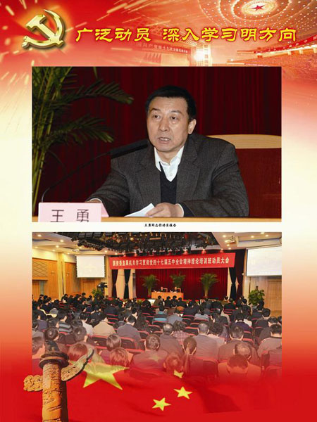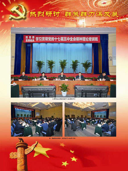 為深入學習貫徹黨的十七屆五中全會精神,準確把握“十二五”期間發展的主題、主線、目標任務和重大舉措,總結“十一五”,謀劃“十二五”,推進國資委各項工作取得新進展,按照委黨委的部署,11月16日至12月9日,在云湖度假村和虎峪園林山莊,舉辦了4期學習貫徹五中全會精神理論培訓班。國資委主任、黨委書記王勇為參加1-4期培訓班的全體同志作動員報告,委領導黃淑和、黃丹華、孟建民、賈福興同志,副秘書長杜淵泉、閻曉峰、郭建新同志和機關全體黨員干部及直屬事業單位、管理局系統黨政領導班子成員,直管協會和部分京外企業在京單位黨委負責同志共計1100余人參加了培訓。培訓期間,王勇同志和黃丹華同志到培訓班看望參加培訓的同志,并參加小組討論,聽取大家對委里工作的意見和建議,與大家共謀國資監管、央企發展、機關建設的思路和措施。