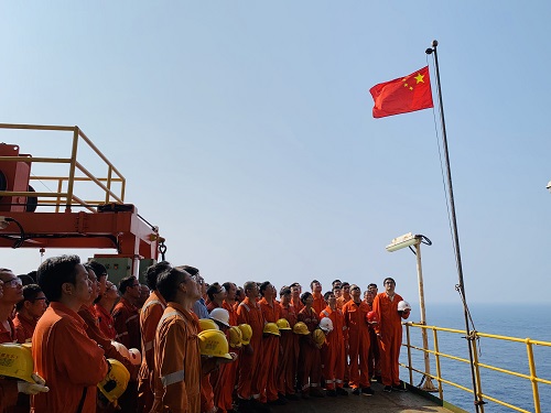國(guo)慶長假期間,中(zhong)國(guo)海油陸(lu)豐(feng)13-2平臺100多名員(yuan)工堅守(shou)崗位(wei)。10月1日,平臺合理安排(pai)作業,在確(que)保各項作業平穩運(yun)行前提下,全體員(yuan)工參加升(sheng)國(guo)旗并一起(qi)觀看(kan)國(guo)慶閱兵活動。