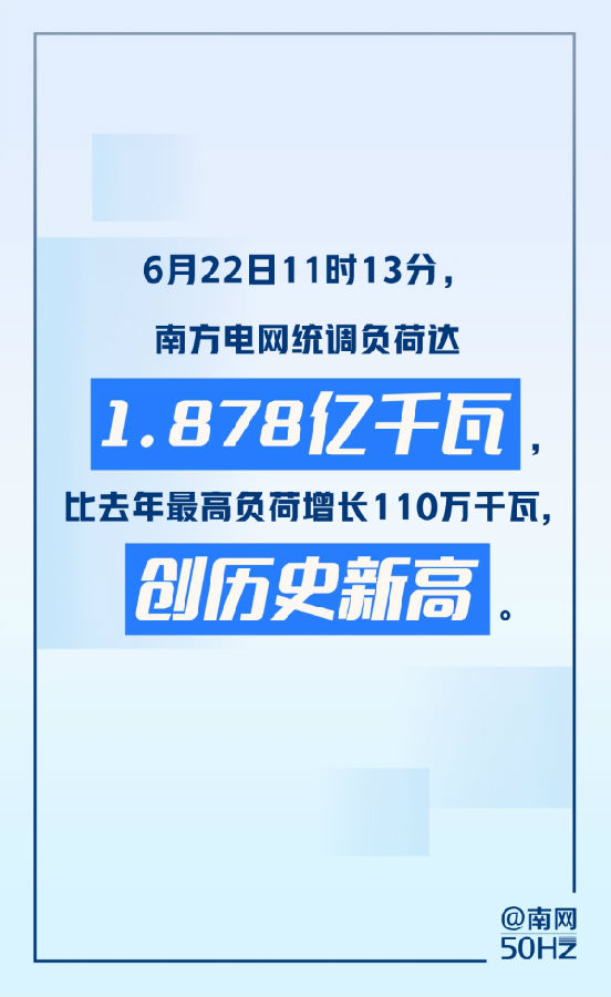 6月(yue)22日11時13分(fen),南方(fang)電網(wang)統調負荷(he)(he)達1.878億千(qian)瓦(wa)(wa),比去(qu)年最(zui)高負荷(he)(he)增長(chang)110萬千(qian)瓦(wa)(wa),創下(xia)歷(li)史新(xin)高。