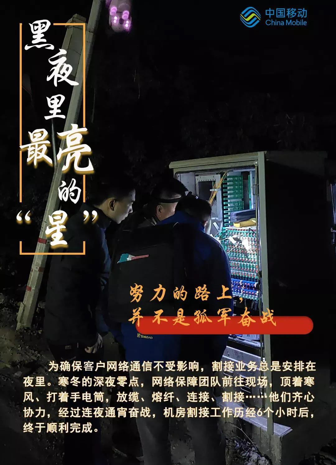 星光不負(fu)趕路人,歲月不負(fu)有心人,無數(shu)個(ge)黑夜(ye)里(li)的(de)努力(li),凝聚著移動人對(dui)通(tong)信(xin)事(shi)業(ye)的(de)熱愛(ai)與責(ze)任(ren),肩負(fu)通(tong)信(xin)使(shi)命,奮(fen)斗在(zai)路上!