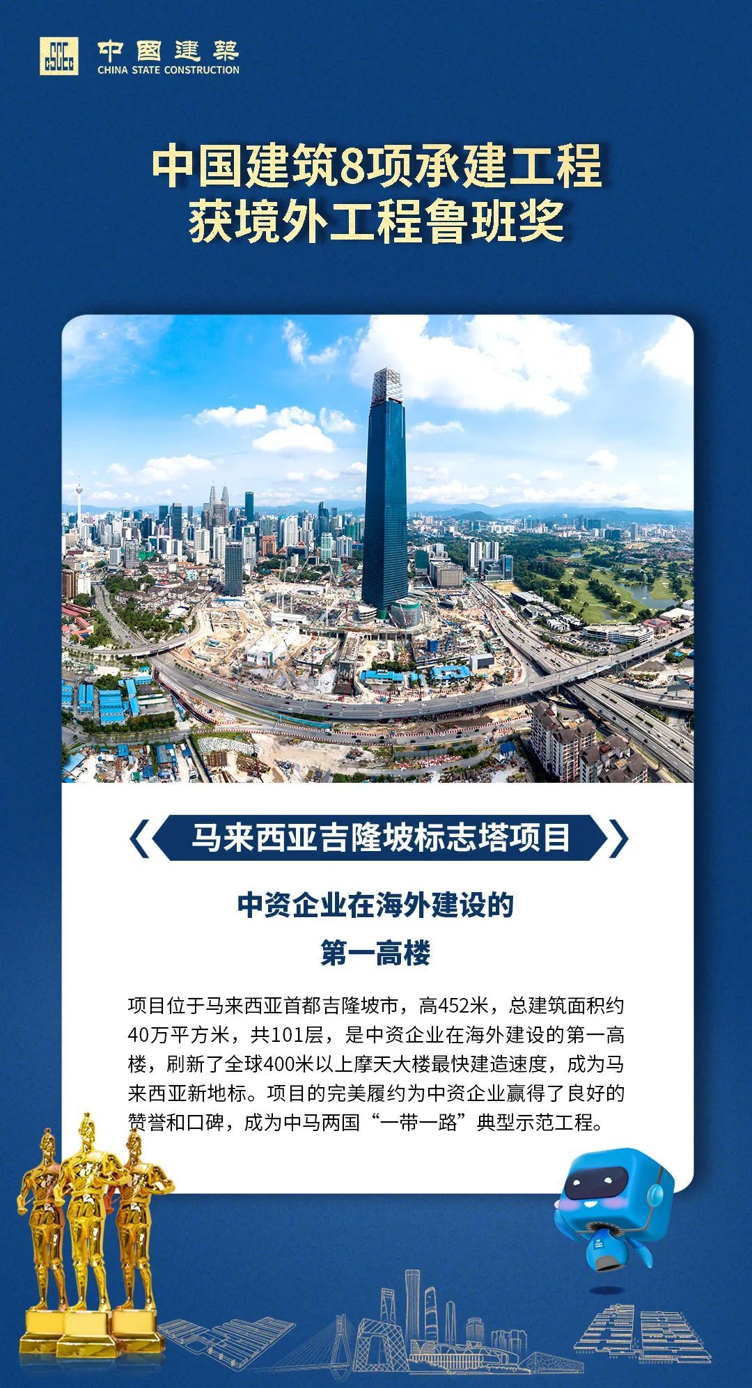 近日,中(zhong)國建(jian)(jian)筑業協會公(gong)布了2020年(nian)(nian)境外工(gong)程(cheng)魯班獎評(ping)選結果。中(zhong)國建(jian)(jian)筑承建(jian)(jian)的莫桑(sang)比克N6國道改擴建(jian)(jian)工(gong)程(cheng)、印度尼(ni)西(xi)亞(ya)萬鴉老(lao)至比通高速公(gong)路大(da)橋、中(zhong)國建(jian)(jian)筑巴(ba)基斯(si)坦PKM項(xiang)目(mu)、中(zhong)國駐(zhu)慕尼(ni)黑總領館館舍新建(jian)(jian)工(gong)程(cheng)、剛果(布)國家1號公(gong)路、印象(xiang)馬六甲歌劇院項(xiang)目(mu)、太子集團總部項(xiang)目(mu)、馬來西(xi)亞(ya)吉隆(long)坡標志塔項(xiang)目(mu),中(zhong)國建(jian)(jian)筑參建(jian)(jian)的赤道幾內亞(ya)馬拉(la)博國家公(gong)園(yuan)項(xiang)目(mu),共9項(xiang)工(gong)程(cheng)入選。下面(mian)一起看看今年(nian)(nian)中(zhong)國建(jian)(jian)筑獲獎工(gong)程(cheng)風采吧!