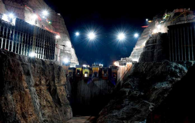 5月31日,正在緊張施工的烏東德水電站大壩主體工程夜景。新華社記者陳曄華 攝