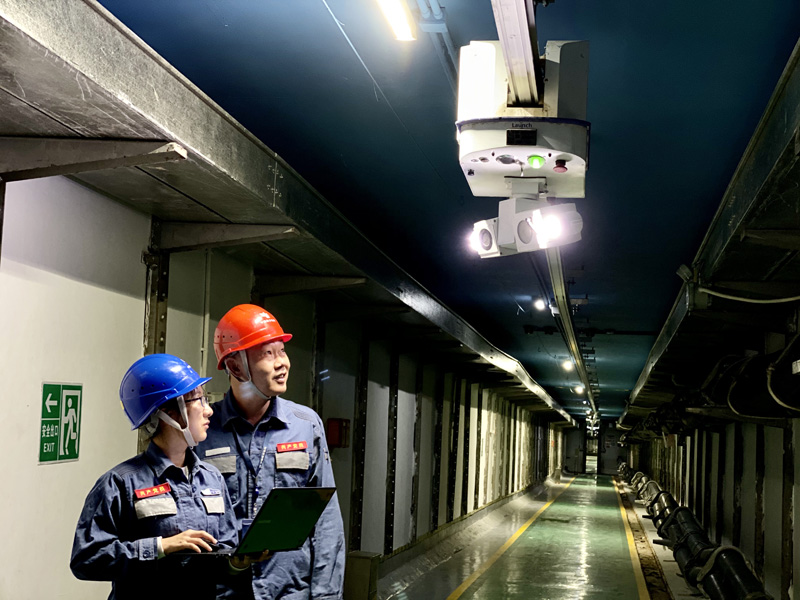 2019年12月,在珠海橫琴綜合管廊電力隧道里,南方電網廣東珠海供電局工作人員操作巡檢機器人對電纜隧道動態巡檢。林丹丹 攝