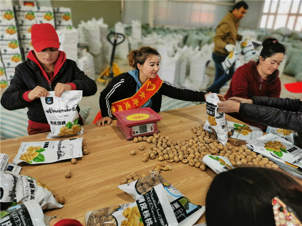 華電新疆公(gong)(gong)司采(cai)取“農戶(hu)(hu)(hu)+合(he)作社(she)+企(qi)業”模式,通過(guo)設計定制(zhi)包裝(zhuang)、幫助(zhu)裝(zhuang)盒包裝(zhuang)、聯系物流公(gong)(gong)司等“一條龍”服務,幫助(zhu)創建上(shang)阿圖(tu)什品牌核桃,并協助(zhu)做好產品分(fen)級、包裝(zhuang)、分(fen)揀、檢測(ce)等環節,讓(rang)優質(zhi)的土特產能夠(gou)及(ji)時到(dao)達全(quan)國(guo)各地。該公(gong)(gong)司2019年累計銷售核桃60500千克,帶動300余戶(hu)(hu)(hu)建檔立卡(ka)貧困戶(hu)(hu)(hu)足(zu)不出戶(hu)(hu)(hu)在(zai)自家門口(kou)增收。