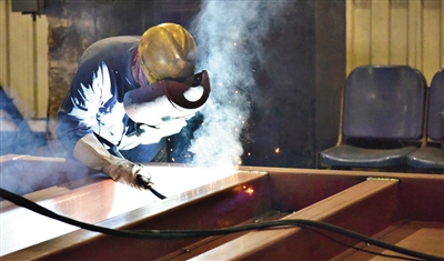 工人在中車齊車公司廠房內焊接C70E型貨車