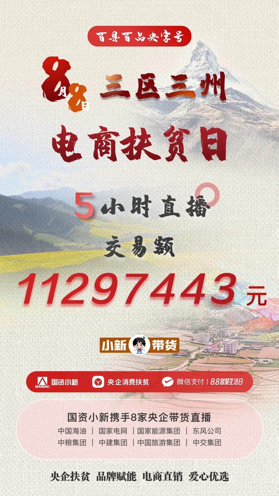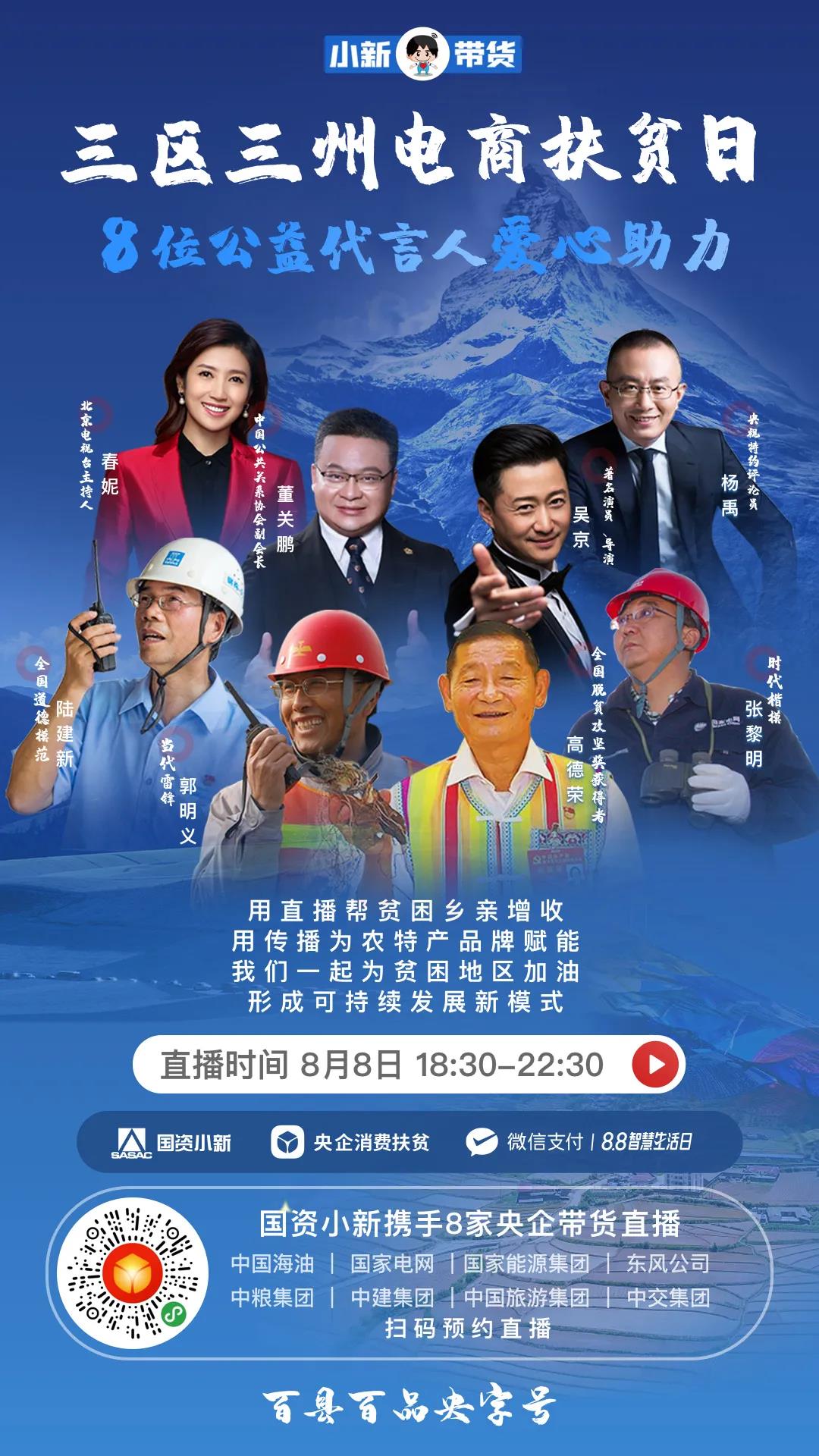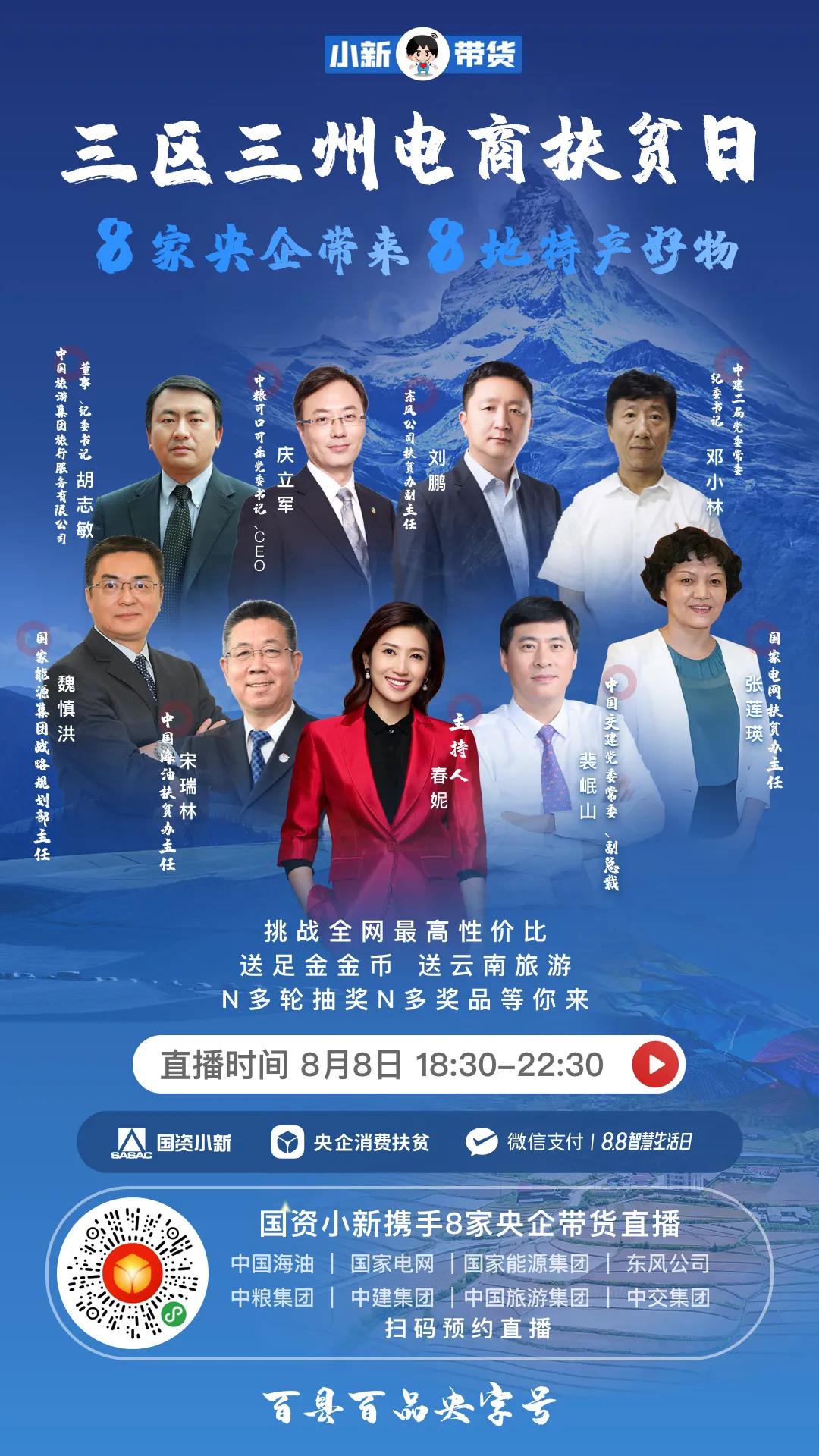 8家(jia)中(zhong)(zhong)央企業攜(xie)手定點扶(fu)貧(pin)縣市的(de)(de)(de)亮相直(zhi)播間,包括中(zhong)(zhong)國海油幫(bang)扶(fu)的(de)(de)(de)甘(gan)(gan)肅甘(gan)(gan)南(nan)州(zhou)(zhou)(zhou)合(he)作市,國家(jia)電網幫(bang)扶(fu)的(de)(de)(de)青海果洛州(zhou)(zhou)(zhou)瑪多縣,國家(jia)能源(yuan)集(ji)(ji)團幫(bang)扶(fu)的(de)(de)(de)四川涼山(shan)州(zhou)(zhou)(zhou)普(pu)格縣,中(zhong)(zhong)交集(ji)(ji)團幫(bang)扶(fu)的(de)(de)(de)云南(nan)怒(nu)江(jiang)傈僳族自(zi)治州(zhou)(zhou)(zhou)、東風公司(si)幫(bang)扶(fu)的(de)(de)(de)西藏昌都地區(qu)貢覺縣,中(zhong)(zhong)糧集(ji)(ji)團幫(bang)扶(fu)的(de)(de)(de)四川甘(gan)(gan)孜州(zhou)(zhou)(zhou)石渠縣,中(zhong)(zhong)建集(ji)(ji)團幫(bang)扶(fu)的(de)(de)(de)甘(gan)(gan)肅臨夏州(zhou)(zhou)(zhou)康樂縣、卓尼縣、康縣和中(zhong)(zhong)國旅游(you)集(ji)(ji)團幫(bang)扶(fu)的(de)(de)(de)云南(nan)迪慶州(zhou)(zhou)(zhou)香格里拉市。