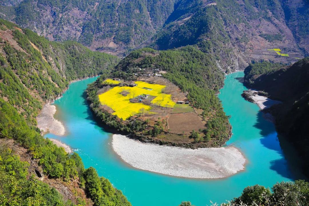 怒江,流經云南貢山縣丙中洛鄉日丹村附近,由于王箐大懸巖絕壁的阻隔,江水的流向從由北向南改為由東向西,流出300余米后,又被丹拉大山擋住去路,只好再次調頭由西向東急轉,在這里形成了一個半圓形大灣,稱為“怒江第一灣”。