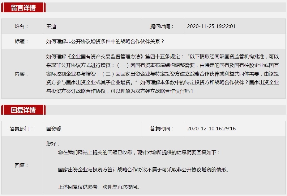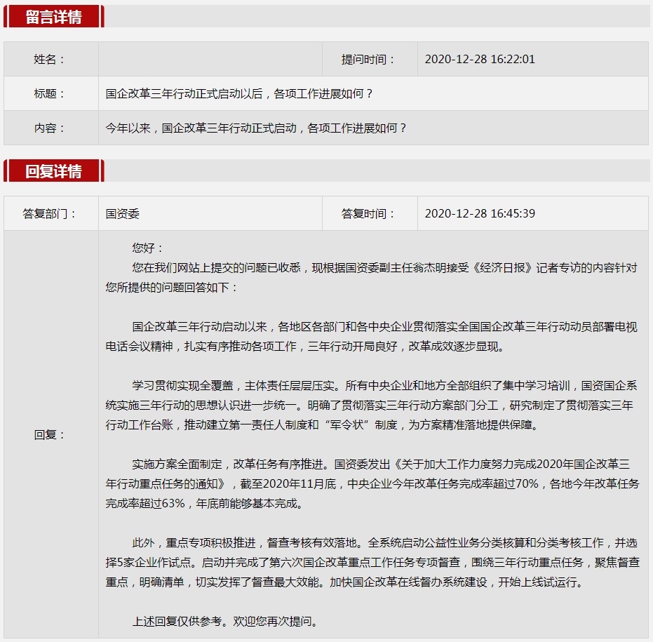 2020年12月國資委網站(zhan)政(zheng)務咨(zi)詢欄目部(bu)分網友提出的咨(zi)詢,我們初步做出了認真的回(hui)應,現選擇五條(tiao)關注度高(gao)、點擊量高(gao)的問題,再(zai)次推薦分享。