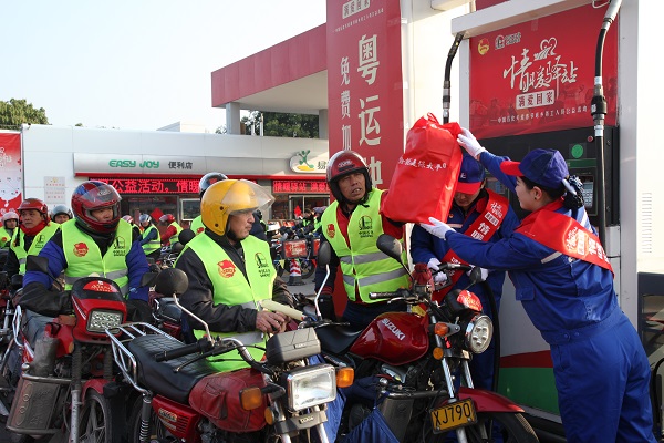 今(jin)年(nian)是中國石化“情(qing)暖(nuan)驛站,滿愛回家”大型公(gong)益(yi)活動(dong)第6年(nian),春運(yun)期間,中國石化攜(xie)手合(he)作(zuo)伙伴為萬名“返鄉(xiang)摩(mo)騎”免費加油、免費郵(you)寄EMS包裹,贈送萬份“易捷福袋”和太平(ping)意外(wai)保險,開通(tong)15條“愛心(xin)大巴”線(xian)路(lu),5000名志愿者在238座加油站,協力溫暖(nuan)返鄉(xiang)路(lu)。