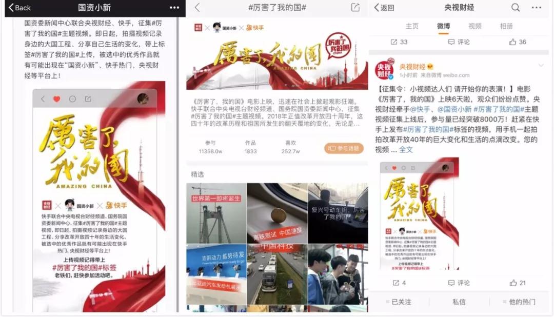 大型紀錄電影《厲害了,我的國》于3月2日上映。截至目前,該片全國票房已突破2億,刷新了中國紀錄電影票房新紀錄。3月7日起,國資委免费菠萝视频app下载聯合央視財經、快手,向廣大網民征集#厲害了我的國#主題視頻。大家紛紛拍攝視頻記錄身邊的大國工程、分享自己生活的變化,僅快手短視頻平臺,#厲害了我的國#話題一周之內就突破了1.135億參與量,網友制作了1833部視頻作品,收獲了252.7萬次點贊!