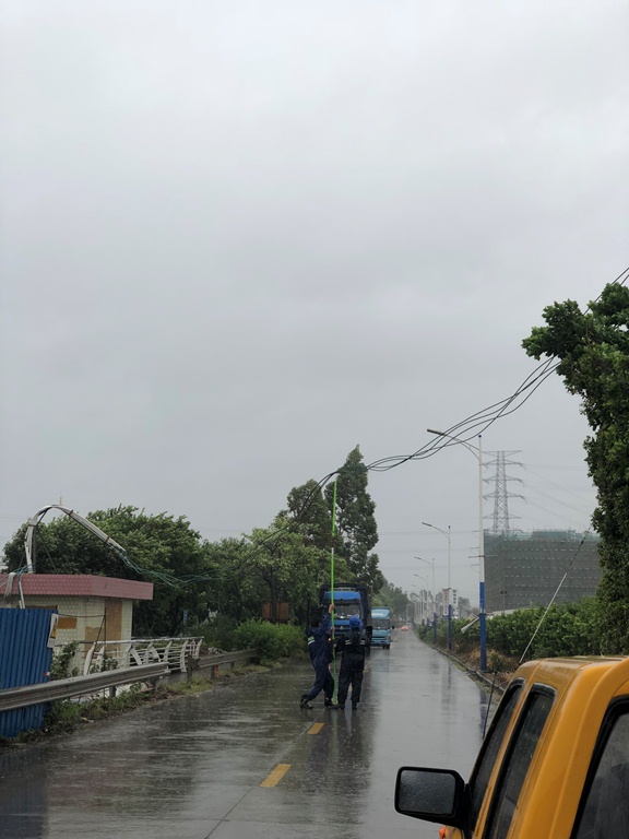 那天(tian),超強臺風(feng)“山(shan)竹”登陸廣東,佛山(shan)全(quan)(quan)市已經(jing)啟動了氣象災害(hai)I級應(ying)(ying)急響應(ying)(ying),風(feng)力(li)和(he)雨勢都(dou)越(yue)來越(yue)大。作(zuo)為一個剛入職2年(nian)的(de)新員(yuan)工(gong),我還沒(mei)有(you)在(zai)惡劣天(tian)氣下(xia)進行搶修的(de)工(gong)作(zuo)經(jing)驗(yan)。當(dang)天(tian)我正好跟師(shi)傅顏炳全(quan)(quan)負責南海獅山(shan)官窯片區的(de)電力(li)搶修工(gong)作(zuo),故(gu)障接(jie)連不(bu)斷,我和(he)顏師(shi)傅從(cong)當(dang)天(tian)上午(wu)就(jiu)奔跑(pao)各處為市民處理故(gu)障,一刻(ke)也沒(mei)有(you)停下(xia)來過(guo)。到下(xia)午(wu)三(san)點左(zuo)右,我和(he)師(shi)傅接(jie)到報障官窯南浦橋附(fu)近(jin)有(you)導線垂落,存(cun)在(zai)人員(yuan)觸(chu)電的(de)風(feng)險(xian),于是我們立即(ji)開(kai)車(che)趕過(guo)去。