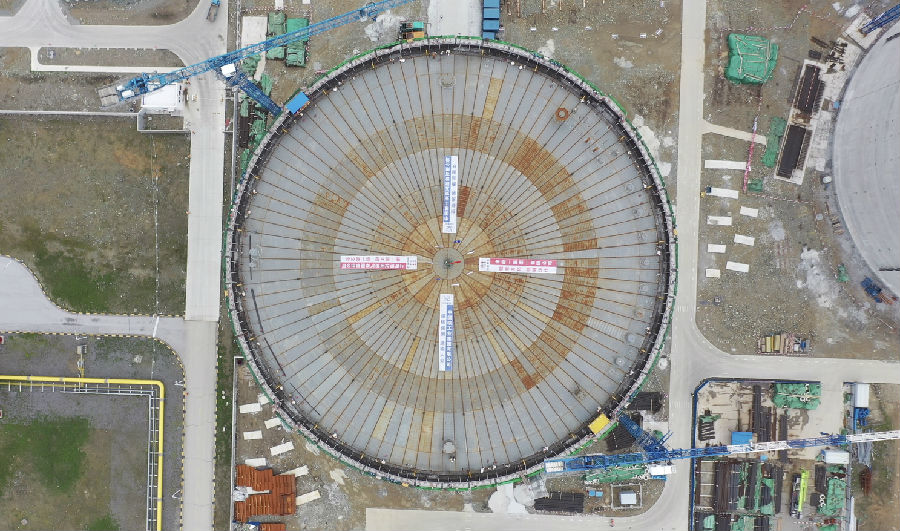 如(ru)此(ci)大的(de)動作(zuo)是如(ru)何做到的(de)?據(ju)項目承建方中核五公(gong)司相關(guan)人(ren)士介紹,儲(chu)(chu)罐(guan)(guan)安裝氣(qi)升頂(ding)技(ji)術是利用穹頂(ding)結構與(yu)儲(chu)(chu)罐(guan)(guan)外壁(bi)之間形(xing)成密閉空間的(de)特點(dian),使用多臺(tai)鼓風機(ji)向密閉空間不斷地(di)輸送低壓空氣(qi),從而罐(guan)(guan)頂(ding)鋼結構按照預定路徑上升至設計高度(du),并與(yu)罐(guan)(guan)頂(ding)承壓環(huan)連接。
