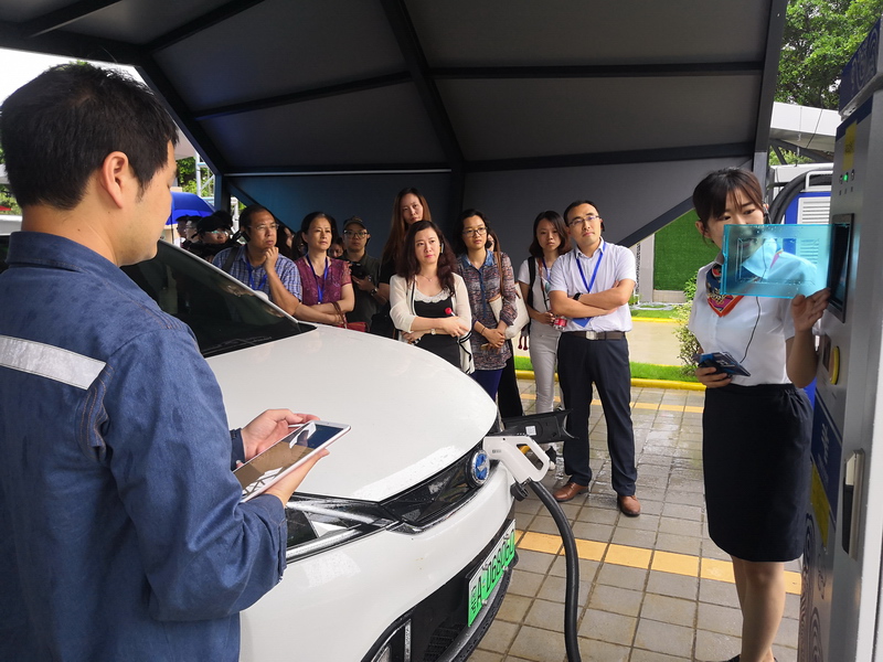 參觀(guan)者到粵港澳大灣區(qu)電(dian)(dian)力營商環(huan)境體驗中心參觀(guan),圖(tu)為了解南方電(dian)(dian)網的(de)充電(dian)(dian)服務(wu)