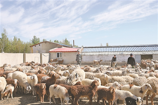 圖為喀爾交鎮牲畜養殖受益人塔拉普汗·沙合多拉,集中放養合作社310只羊,月增收4000元。史智峰攝
