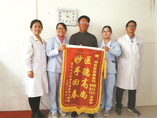 圖為偏癱患者經過兩個月的康復治療,可以生活自理,給商林康復團隊送來錦旗。