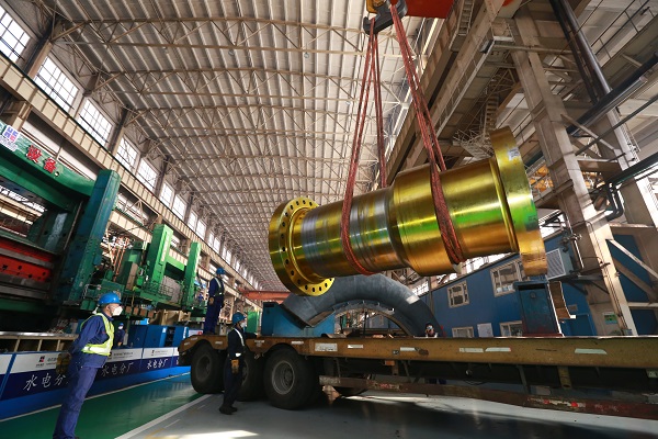 哈電集團有序復(fu)工復(fu)產,操作(zuo)者正在(zai)吊運兩河口4號機主軸。