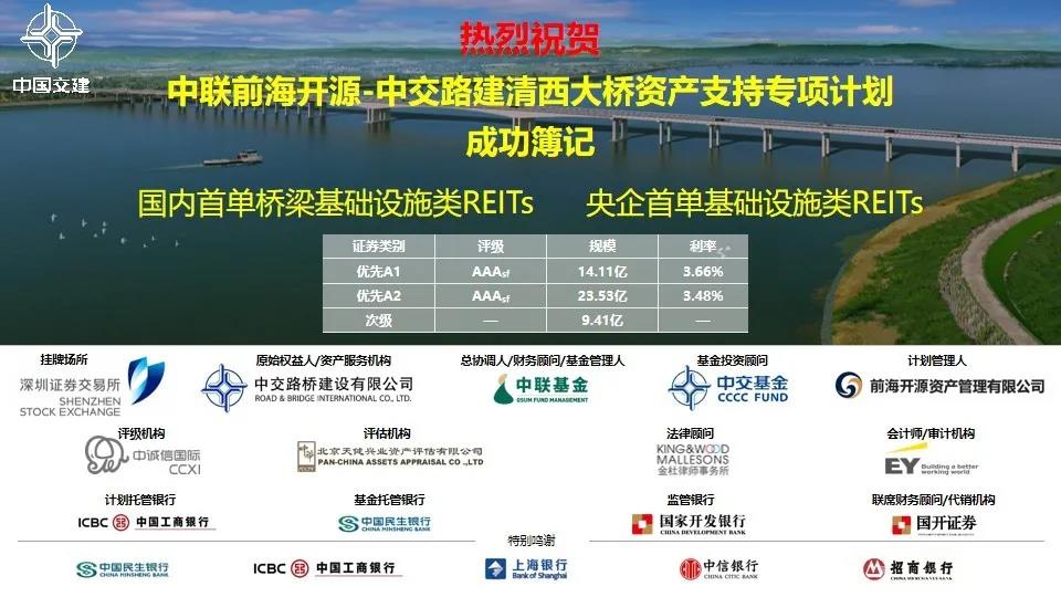 6月9日,中交集團所(suo)屬中交路建在深交所(suo)成(cheng)功簿記發行“中聯(lian)前海開(kai)源-中交路建清西大橋資產(chan)支持專項(xiang)計劃”(以下簡稱“類(lei)REITs”),發行規(gui)模47.05億元,產(chan)品(pin)期限約24年(2N+1),優先級最低(di)發行票(piao)面(mian)利率3.48%。該產(chan)品(pin)是(shi)國(guo)內首單橋梁基礎設施類(lei)REITs、央企首單基礎設施類(lei)REITs。