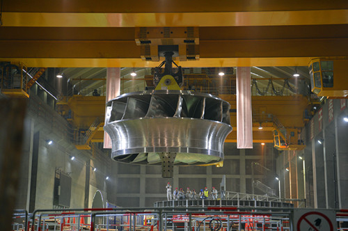 6月21日10時許,白鶴灘(tan)水(shui)(shui)電站左岸1號機(ji)轉輪——全球(qiu)首臺百萬千(qian)瓦水(shui)(shui)電機(ji)組“心臟(zang)”在1300噸橋機(ji)的牽引下(xia)平穩上升,經(jing)過約300米的水(shui)(shui)平移動,于11時許抵(di)達1號機(ji)機(ji)坑正上方(fang),隨(sui)后開始緩(huan)緩(huan)下(xia)降并(bing)成功就位(wei)。