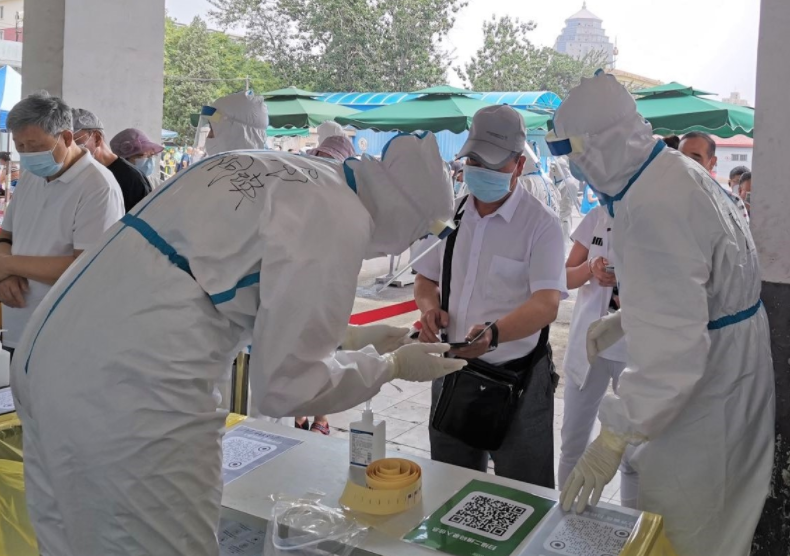 黨員(yuan)何(he)艮(gen)艮(gen)負責配合醫(yi)(yi)護(hu)人(ren)員(yuan)為(wei)小(xiao)區居(ju)(ju)民(min)(min)進行第(di)(di)二次核酸檢(jian)測。在醫(yi)(yi)護(hu)人(ren)員(yuan)的(de)(de)指(zhi)導下(xia)(xia),何(he)艮(gen)艮(gen)按(an)照(zhao)8大(da)步驟第(di)(di)一(yi)(yi)次學(xue)習穿防(fang)護(hu)服(fu):第(di)(di)1步清理手部衛生;第(di)(di)2步戴一(yi)(yi)次性(xing)帽子;第(di)(di)3步戴醫(yi)(yi)用防(fang)護(hu)口罩并進行氣密性(xing)測試……一(yi)(yi)整套穿戴下(xia)(xia)來,何(he)艮(gen)艮(gen)早(zao)(zao)已滿頭(tou)大(da)汗(han),而脫下(xia)(xia)防(fang)護(hu)服(fu)也是(shi)一(yi)(yi)系列規(gui)定(ding)的(de)(de)煩瑣動作(zuo),加上相(xiang)互檢(jian)查,每次穿脫防(fang)護(hu)服(fu)都需要十(shi)多分鐘時(shi)間。穿著防(fang)護(hu)服(fu),何(he)艮(gen)艮(gen)在38℃的(de)(de)高(gao)溫下(xia)(xia)持續站立工(gong)作(zuo)近(jin)7個小(xiao)時(shi),呼(hu)吸不暢,陣(zhen)陣(zhen)頭(tou)暈,但看到(dao)居(ju)(ju)民(min)(min)烈日下(xia)(xia)排隊(dui)做檢(jian)測而焦(jiao)慮的(de)(de)神情,他又咬(yao)牙(ya)堅持了下(xia)(xia)去。從早(zao)(zao)上7點到(dao)下(xia)(xia)午2點,何(he)艮(gen)艮(gen)共錄入195名居(ju)(ju)民(min)(min)信息,粘貼195個咽拭子試劑(ji)盒標簽并發放到(dao)每人(ren)手中。