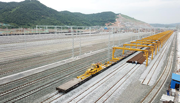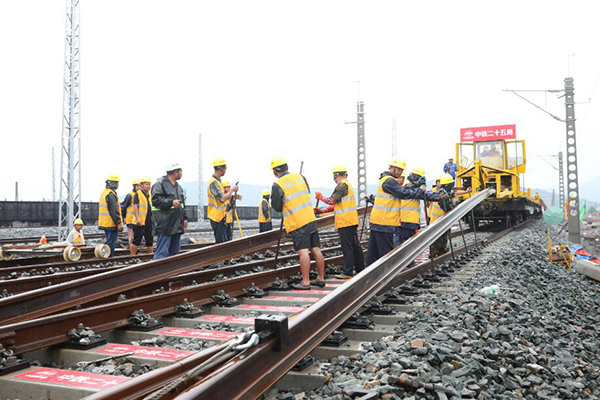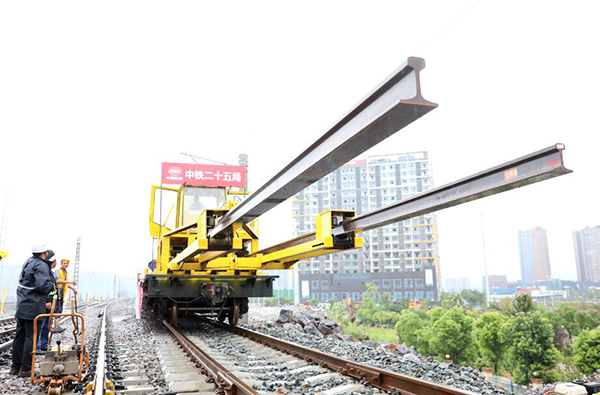 中鐵二十五局承擔(dan)了該工程正線約(yue)60公里以及新建懷化西編(bian)組(zu)站站線約(yue)110公里的鋪(pu)(pu)軌(gui)任務。據現場負(fu)責人介紹,長(chang)軌(gui)鋪(pu)(pu)設采用換(huan)鋪(pu)(pu)法(fa)進行,首先鋪(pu)(pu)設好軌(gui)排,再將25米長(chang)的工具軌(gui)回收(shou),換(huan)鋪(pu)(pu)成500米長(chang)的鋼軌(gui)。