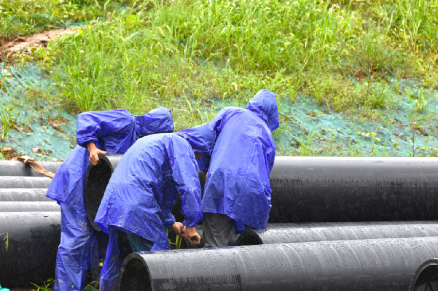 檢(jian)修(xiu)員(yuan)工(gong)用時20個小時,完成全長500多(duo)米的(de)大功率潛水(shui)泵(beng)排(pai)水(shui)管道安裝(zhuang)作(zuo)業,對現場積水(shui)進行抽排(pai),并在廠區道路兩側堆放沙包,防(fang)止出現嚴(yan)重(zhong)積水(shui)。