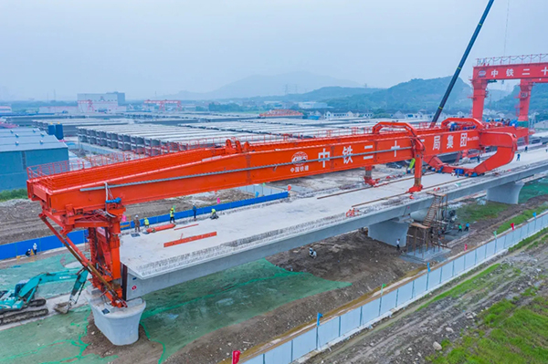在南(nan)沿江城際鐵(tie)路中鐵(tie)二十二局集(ji)團江陰東制(zhi)(zhi)梁場施工現(xian)場,全新研(yan)制(zhi)(zhi)的千噸級分體(ti)式架橋(qiao)機、過隧運梁車通力協作(zuo),穩穩地架設成功一榀長40米(mi)、重達近1000噸的高(gao)鐵(tie)箱梁。