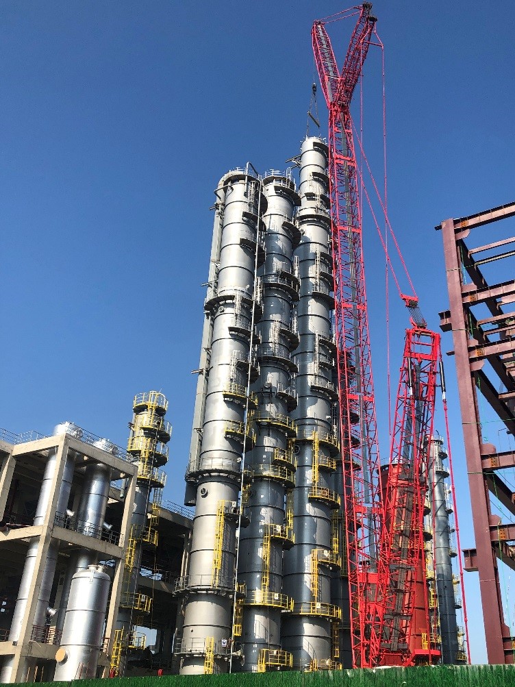 8月5日,中國化學三公司完成山(shan)東華魯恒升(sheng)乙二酸品質提升(sheng)項目20萬噸/年環乙醇工程11臺(tai)塔器吊(diao)裝。