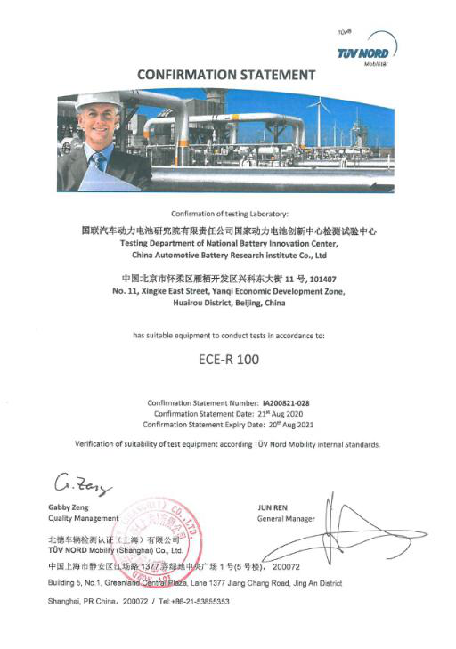 8月26日(ri),德國(guo)TüV北(bei)德認證機(ji)構正式為有研集團(tuan)國(guo)聯汽車動力(li)(li)電池研究院(yuan)有限(xian)責任公司(si)國(guo)家動力(li)(li)電池創新(xin)中心(xin)檢測試驗中心(xin)發放了ECE-R100檢測能(neng)力(li)(li)授權證書。