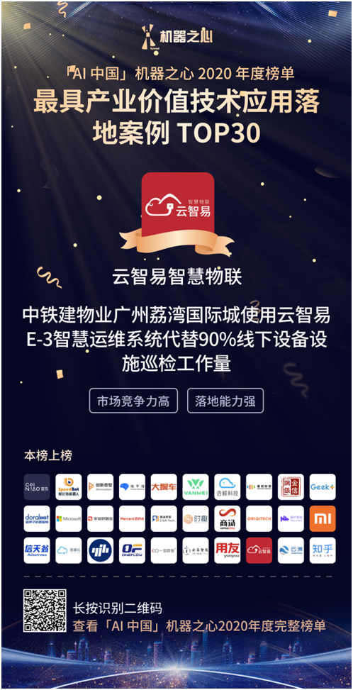 據了解,作為目前國內(nei)人工智(zhi)能界(jie)規模最(zui)(zui)大、評選(xuan)最(zui)(zui)權威的(de)(de)年度(du)獎(jiang)項,機器之心年度(du)獎(jiang)項已成(cheng)為我國人工智(zhi)能產(chan)業(ye)的(de)(de)風向標。“最(zui)(zui)具產(chan)業(ye)價值技術(shu)應用落(luo)地案例TOP30”榜單(dan)主要(yao)關(guan)注近兩年落(luo)地實踐的(de)(de)數字化轉(zhuan)型、產(chan)業(ye)智(zhi)能化升級案例及相關(guan)成(cheng)果,其獲(huo)獎(jiang)案例均(jun)為所處行業(ye)的(de)(de)標桿項目。此次中鐵建物業(ye)廣(guang)州(zhou)荔灣國際(ji)城智(zhi)慧社(she)區(qu)項目榮登榜單(dan),為行業(ye)智(zhi)慧社(she)區(qu)建設(she)提供了一份可借鑒的(de)(de)案例樣本。