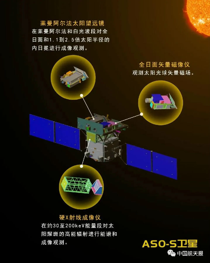 ASO-S由萊(lai)曼阿爾法(fa)太陽望遠鏡,全(quan)日(ri)面矢量磁像儀及硬X射(she)線成像儀等(deng)3臺有效載荷組成,將工(gong)作(zuo)在距離地表(biao)720公里的地球極軌,預期在軌運行不(bu)少于(yu)4年。