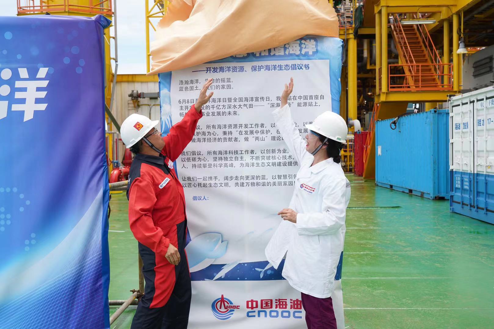 6月8日(ri),在(zai)(zai)距海(hai)(hai)(hai)(hai)南島(dao)150公里(li)的瓊東南陵(ling)水(shui)海(hai)(hai)(hai)(hai)域,來自(zi)新(xin)華社(she)上海(hai)(hai)(hai)(hai)分社(she)、浙(zhe)江(jiang)省舟山市(shi)普陀區沈(shen)家門小學和中國(guo)海(hai)(hai)(hai)(hai)油(you)等不(bu)同行業領域的海(hai)(hai)(hai)(hai)洋人物代表(biao)共(gong)同登(deng)上由我國(guo)自(zi)主研發(fa)建造的全球首座十萬噸(dun)級深(shen)(shen)水(shui)半(ban)潛(qian)式生產儲油(you)平臺“深(shen)(shen)海(hai)(hai)(hai)(hai)一號”能源站,深(shen)(shen)入了解我國(guo)海(hai)(hai)(hai)(hai)洋石油(you)工業發(fa)展及深(shen)(shen)水(shui)油(you)氣開(kai)發(fa)情況,并(bing)在(zai)(zai)世(shi)界(jie)海(hai)(hai)(hai)(hai)洋日(ri)暨全國(guo)海(hai)(hai)(hai)(hai)洋宣傳日(ri)這一天(tian)發(fa)出(chu)了“開(kai)發(fa)海(hai)(hai)(hai)(hai)洋資(zi)源 保護海(hai)(hai)(hai)(hai)洋生態(tai)”的倡議。