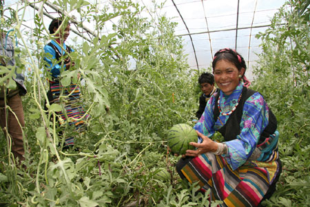 2004年,中化公司援藏隊在崗巴鎮雪村蓋起了蔬菜大棚,并從山東請來技術員長期駐扎種植基地教村民種植蔬菜。2005年,雪村的溫室大柵擴建為15座,雪村15戶農民在技術員的指導下用溫室大柵種植蔬菜,年均收入10000元以上,最高的一戶達15000元。現在棚里種植的蔬菜在崗巴供不應求,大棚蔬菜上市以后,崗巴人首次吃到了在自己的土地上生長的新鮮果蔬,不僅有青菜、青椒、黃瓜、西紅柿等,而且還有西瓜。在海拔4700多米的地方種植蔬菜,不僅使部分農牧民率先走上致富道路,更重要的是使更多的人看到了致富的希望,給當地農牧民帶來了觀念上的改變,商品經濟的意識已經深入人心。
