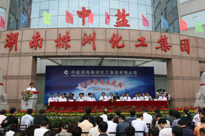 5月23日上午,中鹽湖南株洲化工集團有限公司揭牌暨成立慶典隆重舉行。中共湖南省委常委、常務副省長肖捷,中國鹽業總公司總經理茆慶國為新公司揭牌。