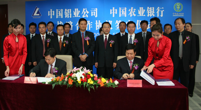 2006年12月18日,中國鋁業公司和中國農業銀行在中鋁大廈簽署了戰略合作協議。中鋁公司黨組書記、總經理、中國鋁業股份有限公司董事長、首席執行官肖亞慶,中國農業銀行黨委書記、行長楊明生出席了簽字儀式并分別發表了熱情洋溢的講話。中國鋁業公司黨組成員、副總經理呂友清,中國農業銀行黨委委員、副行長張云在合作意向書上簽字。