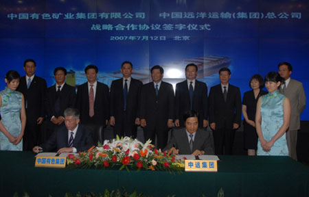 2007年7月12日,中國有色礦業集團有限公司與中國遠洋運輸(集團)總公司在北京簽署戰略合作框架協議。這是兩大集團為貫徹落實中非合作論壇北京峰會精神,積極實施“走出去”戰略所做的實質性工作之一,是實現強強聯合、優勢互補的重大舉措。