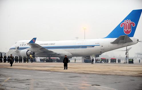 1月17日22:50運送8名中國遇難(nan)維和(he)人員靈柩的(de)包機(ji)從(cong)海地啟程回國,于19日早上(shang)8:57到達北京首都國際機(ji)場。至此(ci),南航救災包機(ji)在(zai)歷(li)時(shi)74小(xiao)時(shi),空中飛行時(shi)間近(jin)39小(xiao)時(shi)之后, 順利完成(cheng)了祖國交(jiao)予的(de)任(ren)務。