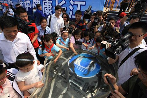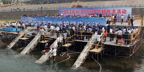 4月17日,在宜昌市胭脂園“長江珍稀魚類放流點”,中國長江三峽集團公司、宜昌市人民政府、世界自然基金會、阿里巴巴集團共同舉辦2013年長江三峽中華鱘放流活動,和當地保護中華鱘志愿者一起將8000余尾中華鱘幼魚放歸長江。