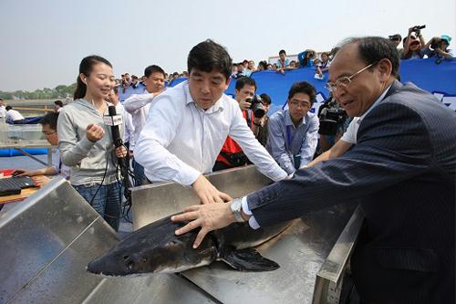 圖為中(zhong)國三(san)峽集團董事長(chang)、黨組書記曹廣(guang)晶(中(zhong))放(fang)流(liu)中(zhong)華鱘。