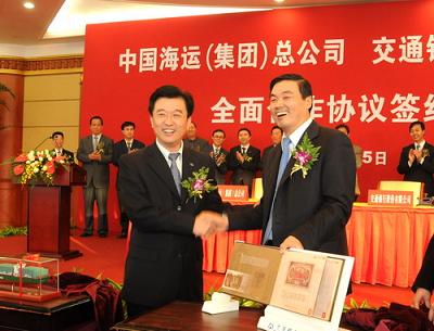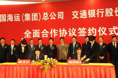 2009年5月5日,中國海運(集團)總公司與交通銀行股份有限公司在上海國際會議中心正式簽署《全面合作協議》。這是兩家企業深入學習實踐科學發展觀、積極應對金融危機、共同響應國務院加快推進上海建設國際金融中心和國際航運中心的具體舉措,也標志著雙方銀企合作邁入了新的階段。上海市委常委、副市長屠光紹出席簽約儀式并致辭,他指出,雙方的這次簽約,對加快上海“兩個中心”(上海國際金融中心和國際航運中心)建設必將發揮代表性示范性的作用。
