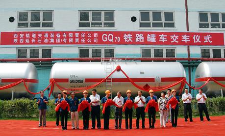 7月23日,長長的汽笛聲中,中國北車西安裝備公司為陜西延長石油公司研制的GQ70專列,在車城員工的注視下披紅掛彩盛裝出廠,給西安裝備公司為陜西延長石油公司研制400輛罐車的項目畫上了句號。