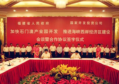 2009年8月21日,國家開發投資公司總裁王會生一行赴榕拜會福建省委書記盧展工、省長黃小晶、副省長張志南等有關省領導,雙方就合作開發湄洲灣石門澳產業園區,推進海峽西岸經濟區建設進行了會談,并簽署了《關于加快湄洲灣(石門澳)產業園開發推進海峽西岸經濟區建設的合作協議》,這標志著國投在海西經濟區的戰略投資布局提高到更高級別的合作層次。