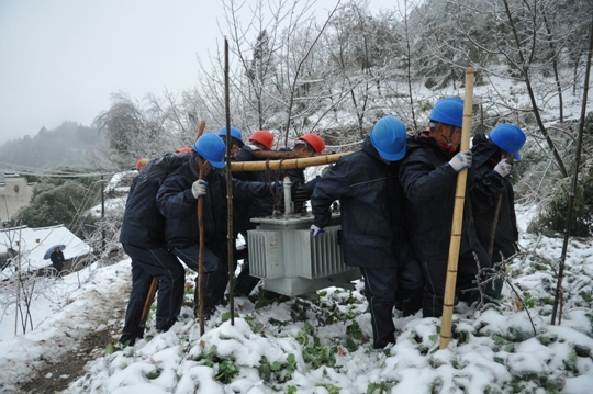 安徽績溪供電公司員工抬著變壓器在雪地里艱難前行