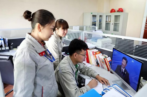 國(guo)投國(guo)際貿易(yi)有(you)限公司員工收看(kan)習(xi)主席主旨演講。