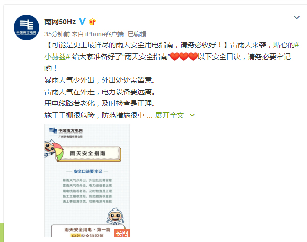 8月10日9時(shi)前(qian)后(hou),南(nan)(nan)(nan)海(hai)熱(re)帶低壓(ya)在海(hai)南(nan)(nan)(nan)南(nan)(nan)(nan)省瓊海(hai)市沿(yan)海(hai)登陸,受(shou)其影響,未來24小時(shi),廣(guang)西東(dong)南(nan)(nan)(nan)部、廣(guang)東(dong)中南(nan)(nan)(nan)部、海(hai)南(nan)(nan)(nan)島(dao)等地的部分地區(qu)將(jiang)有大(da)雨(yu)或暴(bao)雨(yu),其中,廣(guang)東(dong)西南(nan)(nan)(nan)部、海(hai)南(nan)(nan)(nan)島(dao)中北部有大(da)暴(bao)雨(yu),局地特大(da)暴(bao)雨(yu)。南(nan)(nan)(nan)方電網(wang)(wang)公(gong)司已(yi)(yi)于8月9日17時(shi)00分發(fa)(fa)布公(gong)司防(fang)(fang)風(feng)防(fang)(fang)汛藍色預警,并從(cong)當日起,通過該公(gong)司官方新媒體南(nan)(nan)(nan)網(wang)(wang)50Hz微博、微信、網(wang)(wang)站(zhan)和全網(wang)(wang)新媒體矩陣等渠道(dao)持續發(fa)(fa)布信息,提醒(xing)相關(guan)區(qu)域的民眾(zhong)注意防(fang)(fang)雨(yu)及出行安(an)全,并介紹(shao)相關(guan)地區(qu)電網(wang)(wang)的防(fang)(fang)風(feng)防(fang)(fang)雨(yu)應急情況。截至10日19時(shi),已(yi)(yi)發(fa)(fa)布超過13條微博、3條微信及網(wang)(wang)站(zhan)焦點報道(dao)1篇(pian)。
