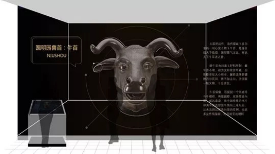 現場,保利數字博物館采用沉浸式投影、人機交互等多媒體技術真實還原保利博物館四大獸首和圓明園海晏堂。四尊現藏于保利藝術博物館的圓明園獸首也作為本次展示內容。