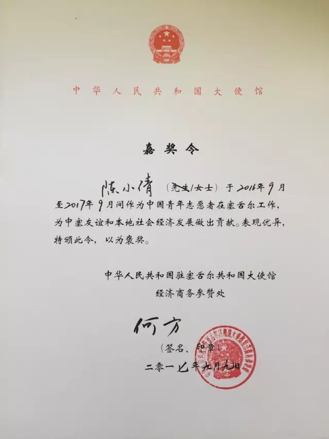 中華人民共(gong)和國(guo)駐塞舌爾共(gong)和國(guo)大使(shi)館(guan)為陳小倩頒(ban)發的嘉獎(jiang)令
