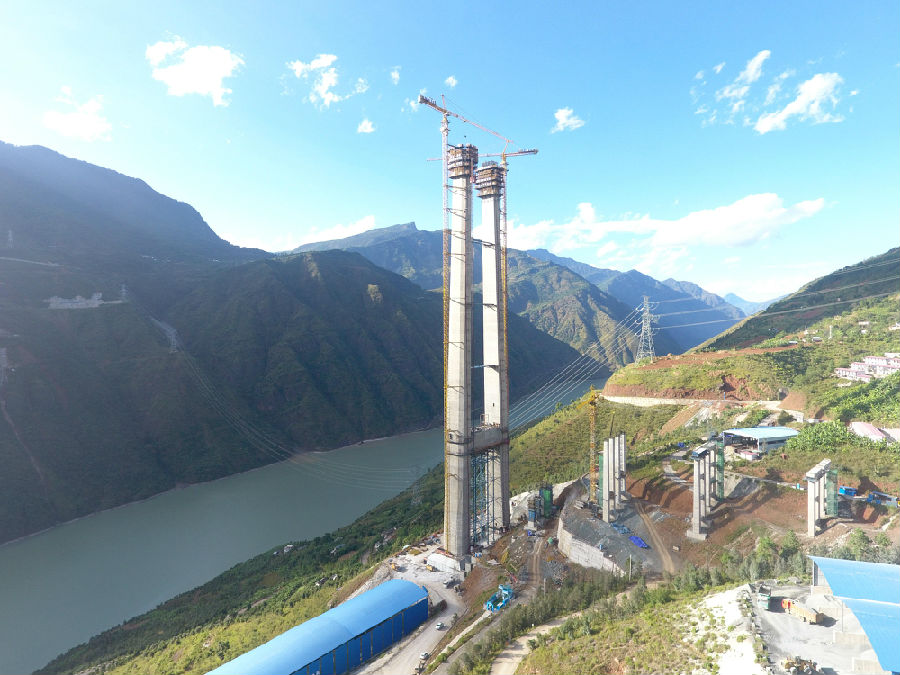 該主塔(ta)為金沙(sha)江(jiang)大(da)橋左幅(fu)塔(ta)柱,塔(ta)高(gao)228米(mi)(含(han)塔(ta)冠),為鋼筋(jin)混凝土門(men)式框架結構(gou)(gou),塔(ta)頂(ding)(ding)距(ju)金沙(sha)江(jiang)江(jiang)面垂直高(gao)度479米(mi),接近(jin)160層樓的高(gao)度。項目部克服現(xian)場交通條件差、氣候(hou)條件多(duo)變(bian)、玄武巖機制砂混凝土高(gao)泵送(song)難等諸多(duo)困(kun)難,歷時200余天完成(cheng)封(feng)頂(ding)(ding),為大(da)橋全面轉入上部結構(gou)(gou)施工打下堅實基(ji)礎。