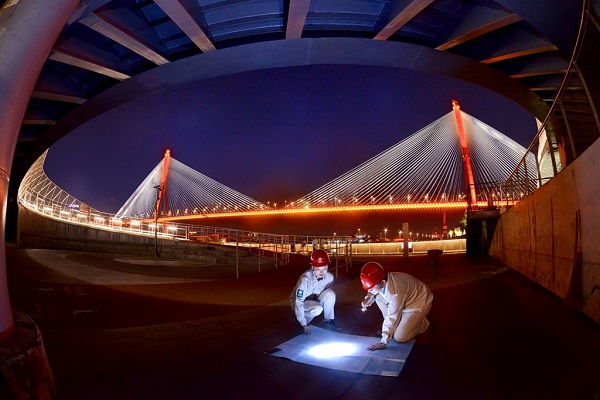 供電員工在楊浦大橋附近梳理供電線路,保障城市景觀燈可靠供電